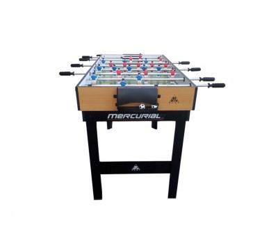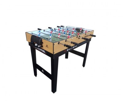 Игровые поля легко менять, они изготовлены из МДФ, ламинированного ПВХ с ярким принтом игровой разметки. Сам стол компактный, не занимает много места, а игрового пространства достаточно, чтобы получить настоящее удовольствие во время игры в домашней обстановке с друзьями или семьёй. Толщина бортиков стола 30 мм, а высота - 12 мм. Конструкция стола устойчива, что актуально для азартных и эмоциональных игроков, особенно при игре в футбол. Прочность и устойчивость ему придают ножки шириной 80 мм и толщиной 13 мм из МДФ с ПВХ покрытием и перекладины толщиной 9 мм.